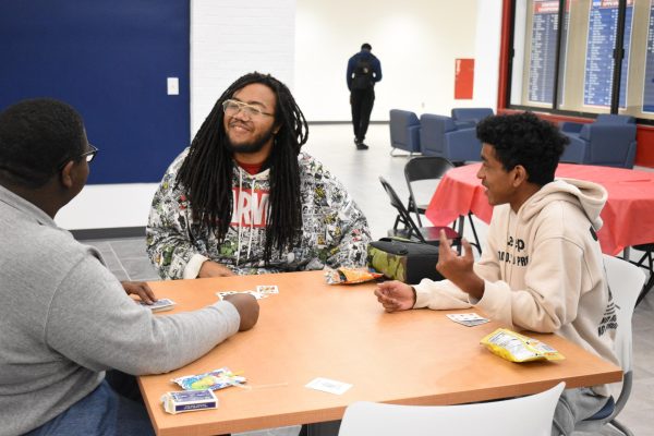 Francis Marion University students Isaiah Richards, Robert Robertson and Caleb Gary sat at one of the tables playing a card game.